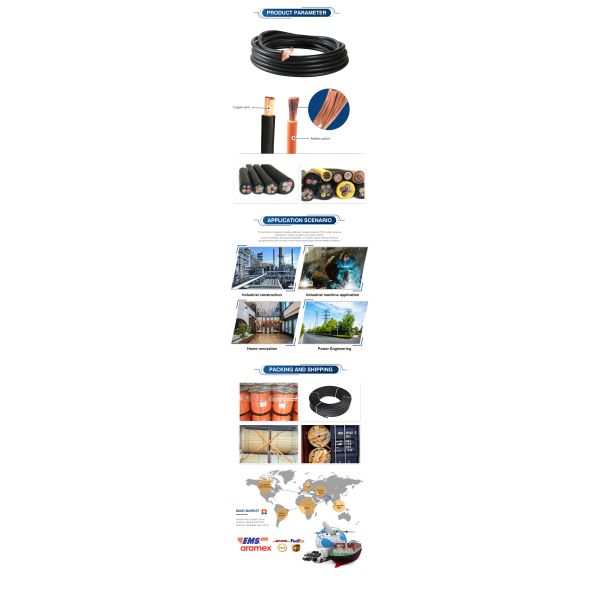 The welding machine cable is a neoprene sheath with heat resistance, oil resistance and non-flammable performance. This product is suitable for the secondary side wiring and connection of the welding machine with AC voltage not exceeding 200V and pulsating DC peak 400V. The maximum working temperature of the cable is 65℃.